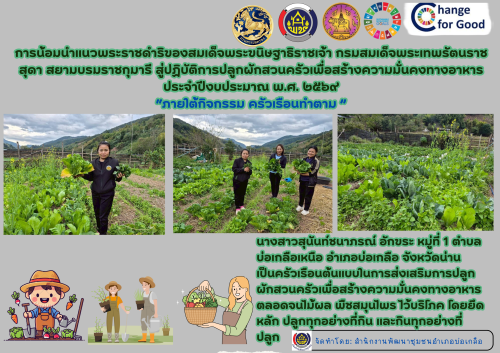 การน้อมนำแนวพระราชดำริของสมเด็จพระขนิษฐาธิราชเจ้ากรมสมเด็จพระเทพรัตนราชสุดา สยามบรมราชกุมารี สู่ปฏิบัติการปลูกผักสวนครัวเพื่อสร้างความมั่นคงทางอาหาร ประจำปีงบประมาณ พ.ศ. ๒๕๖๙“ภายใต้กิจกรรม ครัวเรือนทำตาม ”โดยนางสาวสุนันท์ชนาภรณ์ อักขระ หมู่ที่ 1 ตำบลบ่อเกลือเหนือ อำเภอบ่อเกลือ จังหวัดน่าน เป็นครัวเรือนต้นแบบในการส่งเสริมการปลูกผักสวนครัวเพื่อสร้างความมั่นคงทางอาหาร ตลอดจนไม้ผล พืชสมุนไพร ไว้บริโภค โดยยึดหลัก ปลูกทุกอย่างที่กิน และกินทุกอย่างที่ปลูก